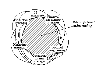 The problem of collaboration is exacerbated when the collaboration spans organizational boundaries, such as groups that comprise members from different functions or divisions. People who work in different functional units not only tend to have diverse ways of defining organizational problems, that are related to their disciplinary and professional backgrounds, but also define problems and their solutions according to the local conventions of their department or function. A group of managers and participants in the work processes to be changed may have difficulty in agreeing what needs to change as they find that they have very little shared understanding of organizational problems – or how to resolve them. Each stakeholder defines the problems in a different way, depending on their experience of these problems and of the situation in which they occur (Gasson, 2004).