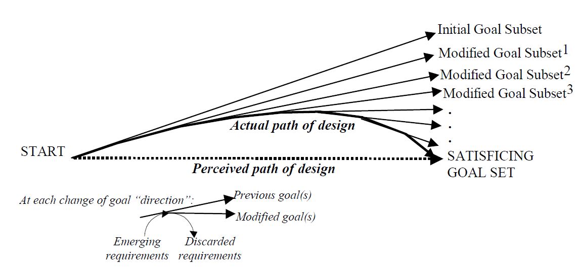 Which means that design-goals are constantly changing between iterations, as shown in Figure 2. The designer starts by designing for the subset of goals they understand. As they explore and test the design with users, they become aware of new requirements and so modify the subset of goals they are designing for. As part of this process, they also discard any requirements that are no longer associated with perceived user needs.