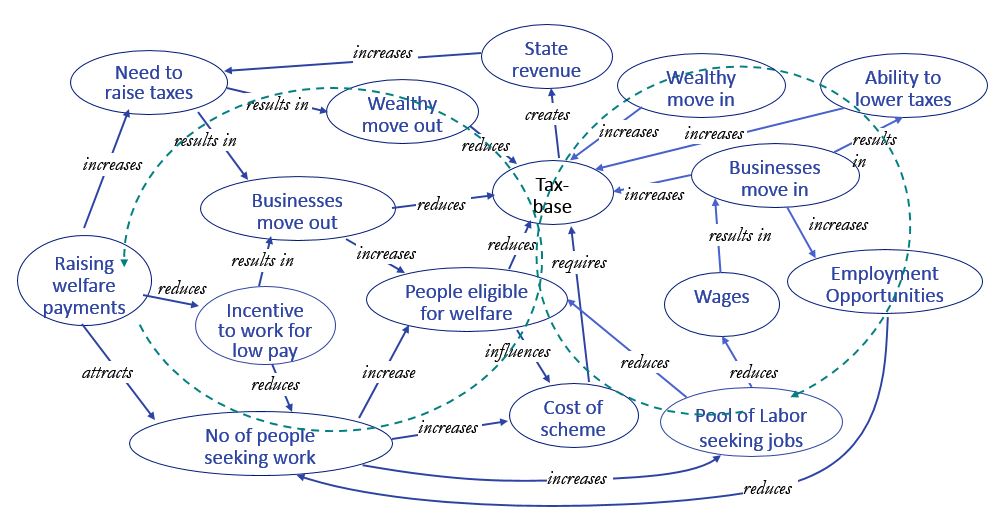 An example of counter-intuitive set of influences is shown in the “systemic” view of a limited social welfare system, given in Figure 1.
